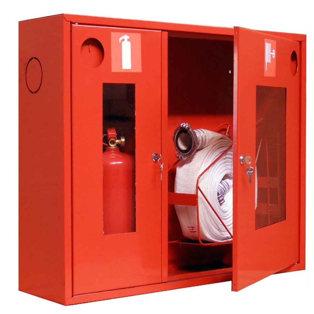 Предлагаемый вариант конструкции предназначен для навесного монтажа внутри помещений, изготовлен из тонколистовой стали и окрашен в красный цвет. Состоит из двух независимых отделений, запираемых дверцами открытого типа, снабженными смотровыми окошками. Каждая дверца имеет замок с индивидуальными ключами, хранящимися в специально оборудованных карманах. Шкаф выполнен сварным методом из стального листа, что обеспечивает его повышенную надежность и прочность.
