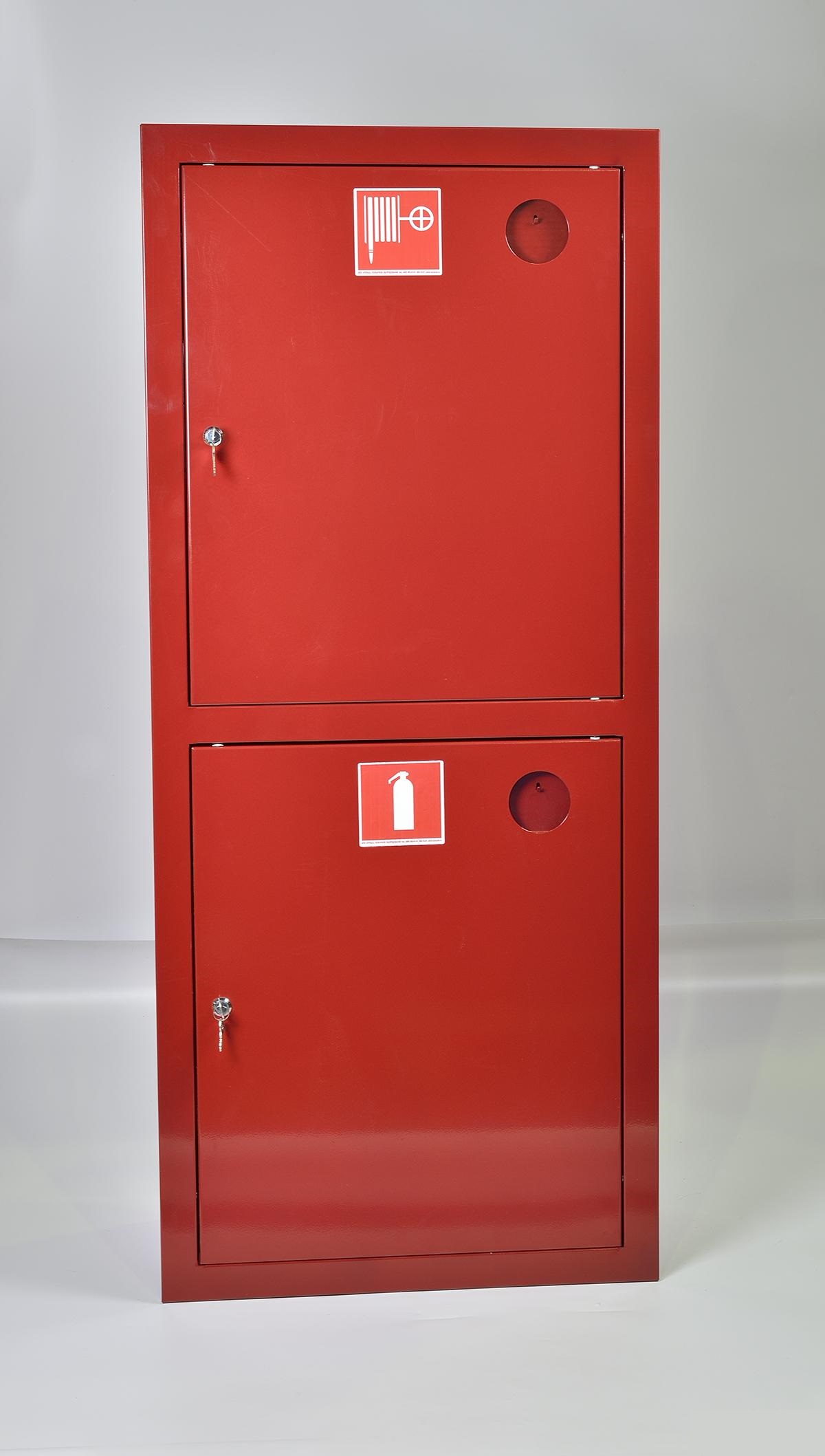 Верхняя рукавная секция оборудована поворотной кассетой для пожарного рукава, на боковых стенках с обеих сторон предусмотрены надрубы для входного отверстия под пожарный кран. Нижняя секция предназначена для хранения двух огнетушителей.
